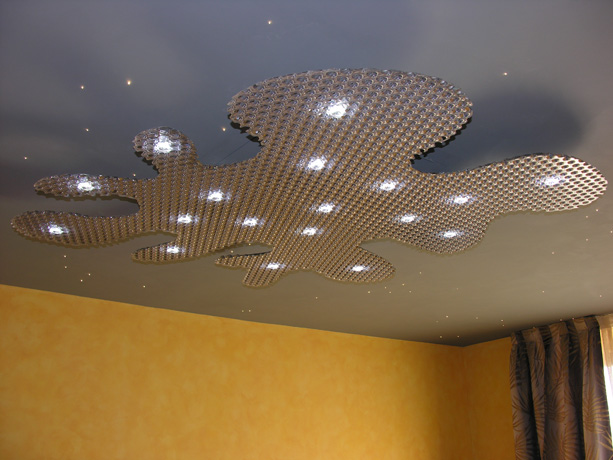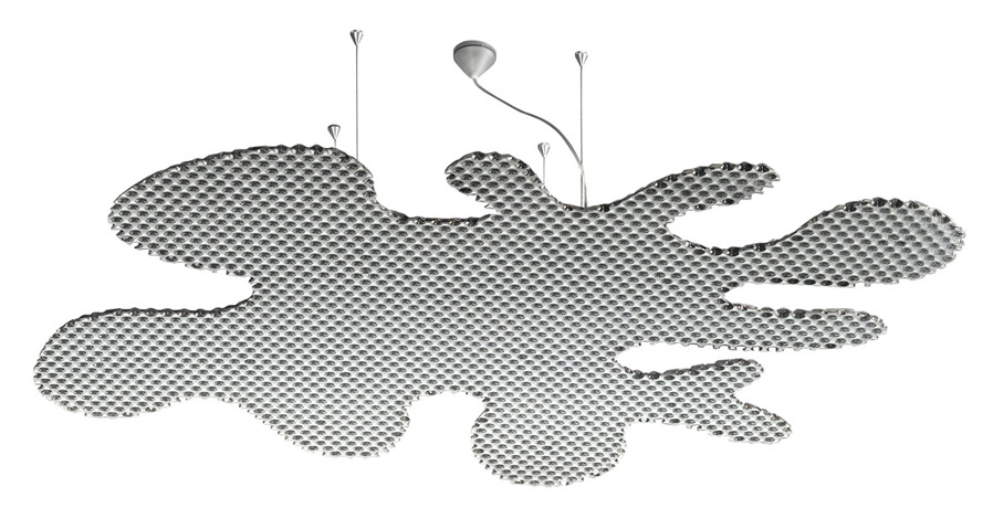Ceiling lamp: “ Splash”, in reflective Bencore alveolar polycarbonate, with Led lights. Measurements: 125 cm. x 140 cm approx. Produced by Ilti Luce, Turin. 2007